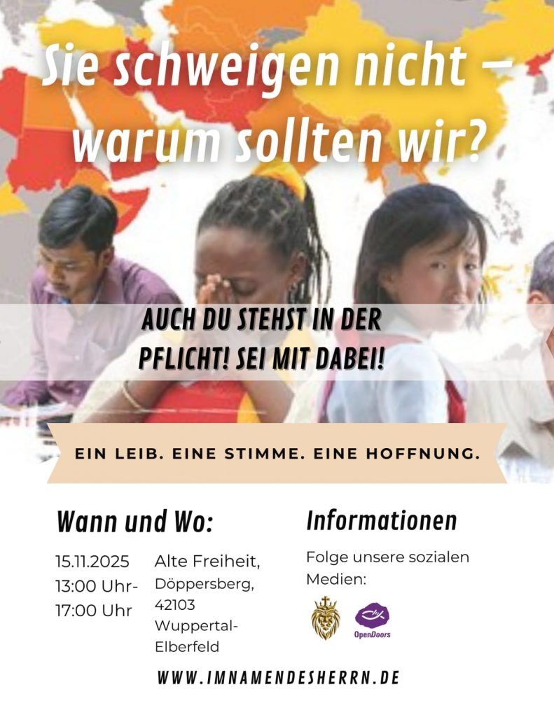 Am 15. November 2025 von 13:00 bis 18:00 Uhr laden wir alle Christen herzlich ein, gemeinsam ein starkes Zeichen der Solidarität zu setzen. Treffpunkt ist der Döppersberg am Wuppertal Hauptbahnhof.
